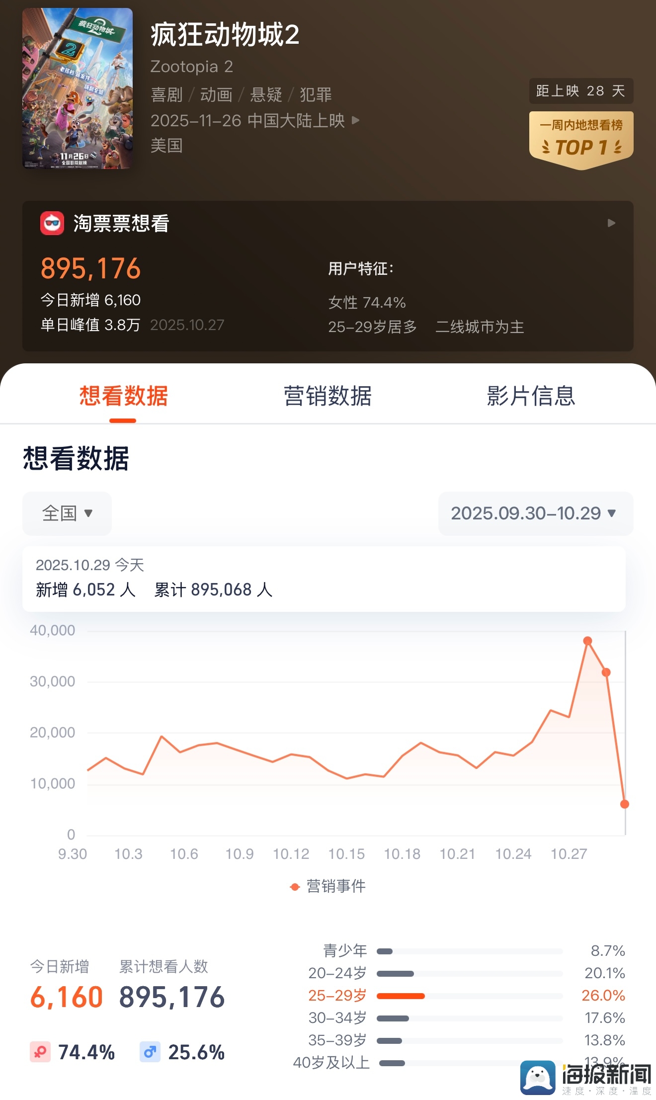 灯塔专业版显示,《疯狂动物城2》在淘票票有89.5万的“想看指数”