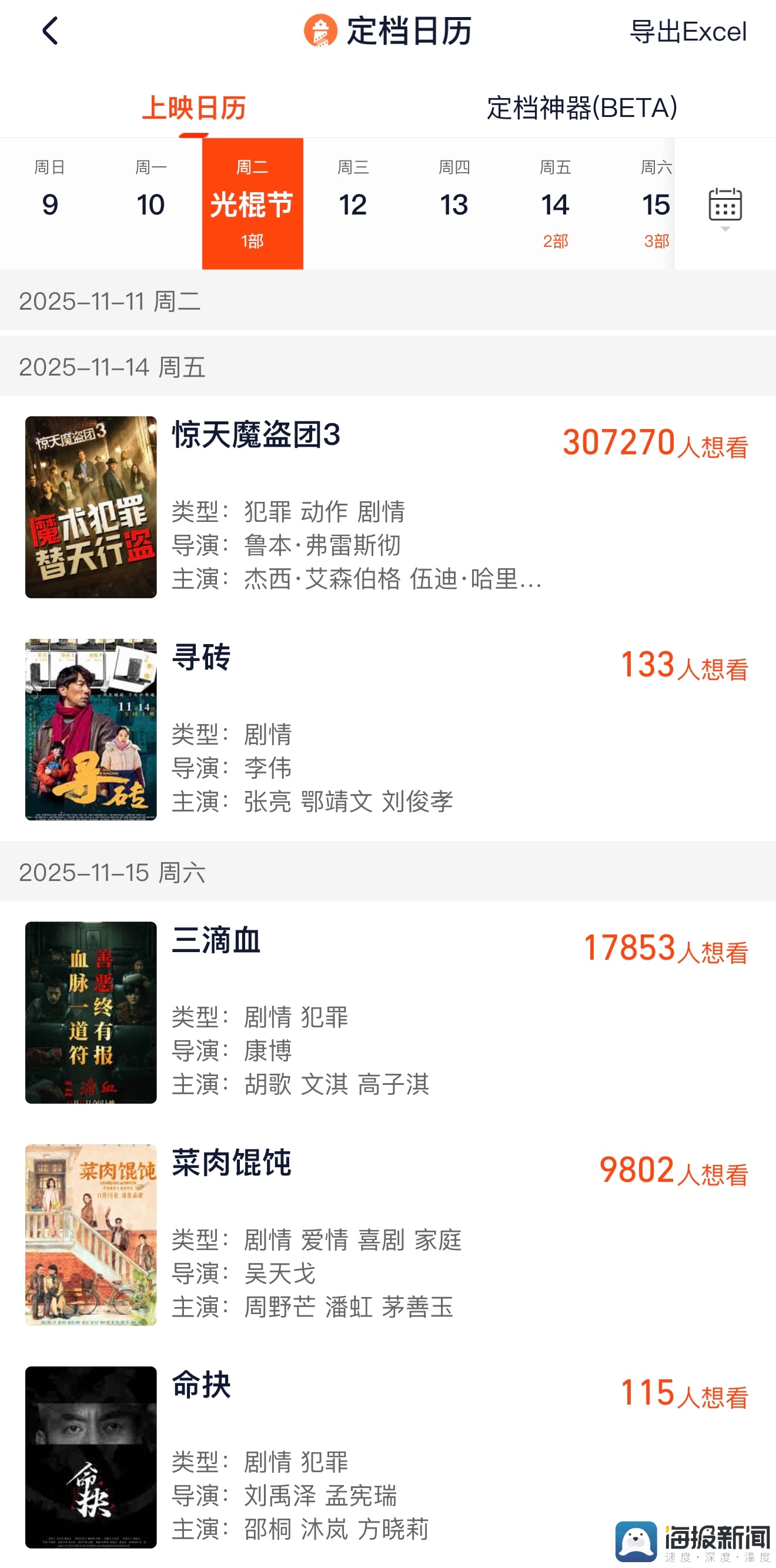 灯塔专业版显示,《惊天魔盗团3》将于11月14日上映